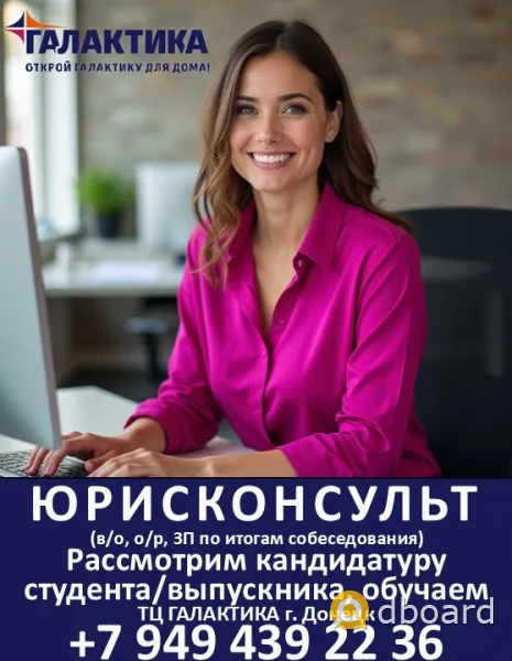 ТЦ Галактика приглашает на работу юрисконсульта (в/о, о/р). Рассматриваем кандидатуру выпускника/студента, обучаем. Обязанности: претензионно -исковая работа, правовое решение вопросов, связанных с жалобами, возвратами, претензиями покупателей, составление, согласование и проверка договоров Официальное оформление, полный соц. пакет, комплексное питание, тренажерный зал, корпоративные скидки, обучение и карьерный рост