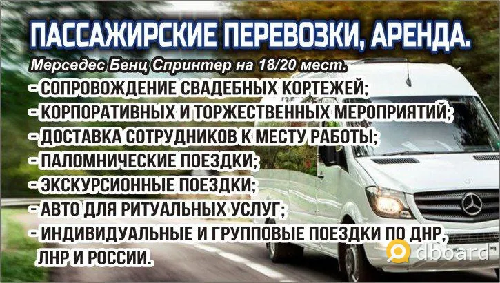 Аренда , заказ , комфортабельных микроавтобусов: Mercedes Benz, Мерседес Спринтер (20/18/ 15 мест). Осуществляем пассажирские перевозки в любых направлениях: по городу, области ДНР, ЛНР, РФ,свадьбы, похороны, экскурсии, трансферы, туры выходного дня, помогаем организовывать доставку сотрудников на постоянной или временной основе. Вы получаете профессиональные услуги, а также индивидуальный подход так как у нас работают опытные водители с многолетним стажем, пунктуальные, внимательные и отлично знающие маршруты.