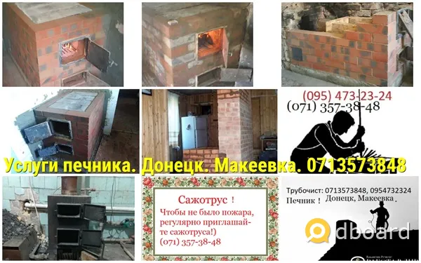 Услуги печника в Донецке и Макеевке. Строительство печей. Ремонт. Гарантированное устранение причины обратной тяги в печи в любом случае..) Чистка груб. угольных котлов, каминов и дымоходов. Запуск печи после длительного перерыва ее эксплуатации. Подготовка печи к работе в отопительный сезон. Трушу профессионально сажу ершами с гарантией. +7949-357-38-48, (071) 357-38-48, +7949 509-66-65 Выполненную свою работу по устранению причины обратной тяги выполняю с гарантией на 6 месяцев. Строительство печи с гарантией навсегда ! Обращайтесь добрые люди, все районы и пригород Донецка, Макеевки. Прошу не обращаться ко мне не адекватным людям, пьющим, выпившим, наглецам и людям считающим оплату за работу печника, сажотруса дорогой, а например оплату за работу стоматолога правильной. Сразу вношу в черный список. Спасибо. С уважением Александр.